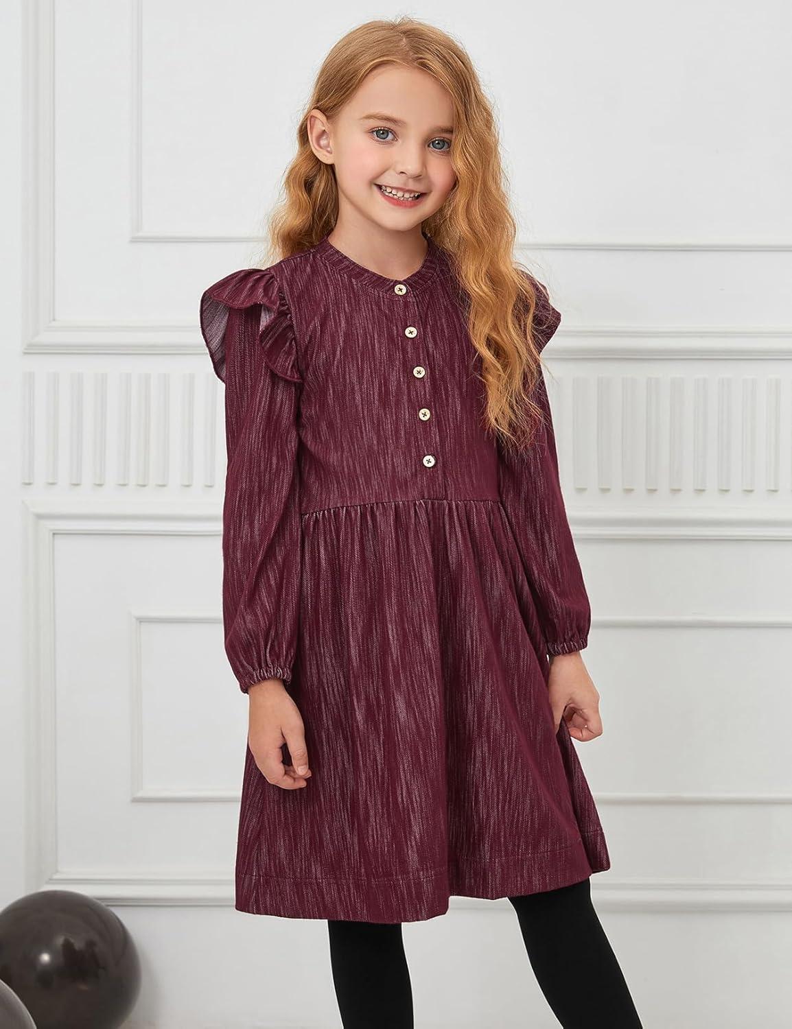 Perfashion Girls Denim Dress Flutter Long Sleeve Classic Jean Blue Button Down Dresses for 6-15 Years(Burgundy1)