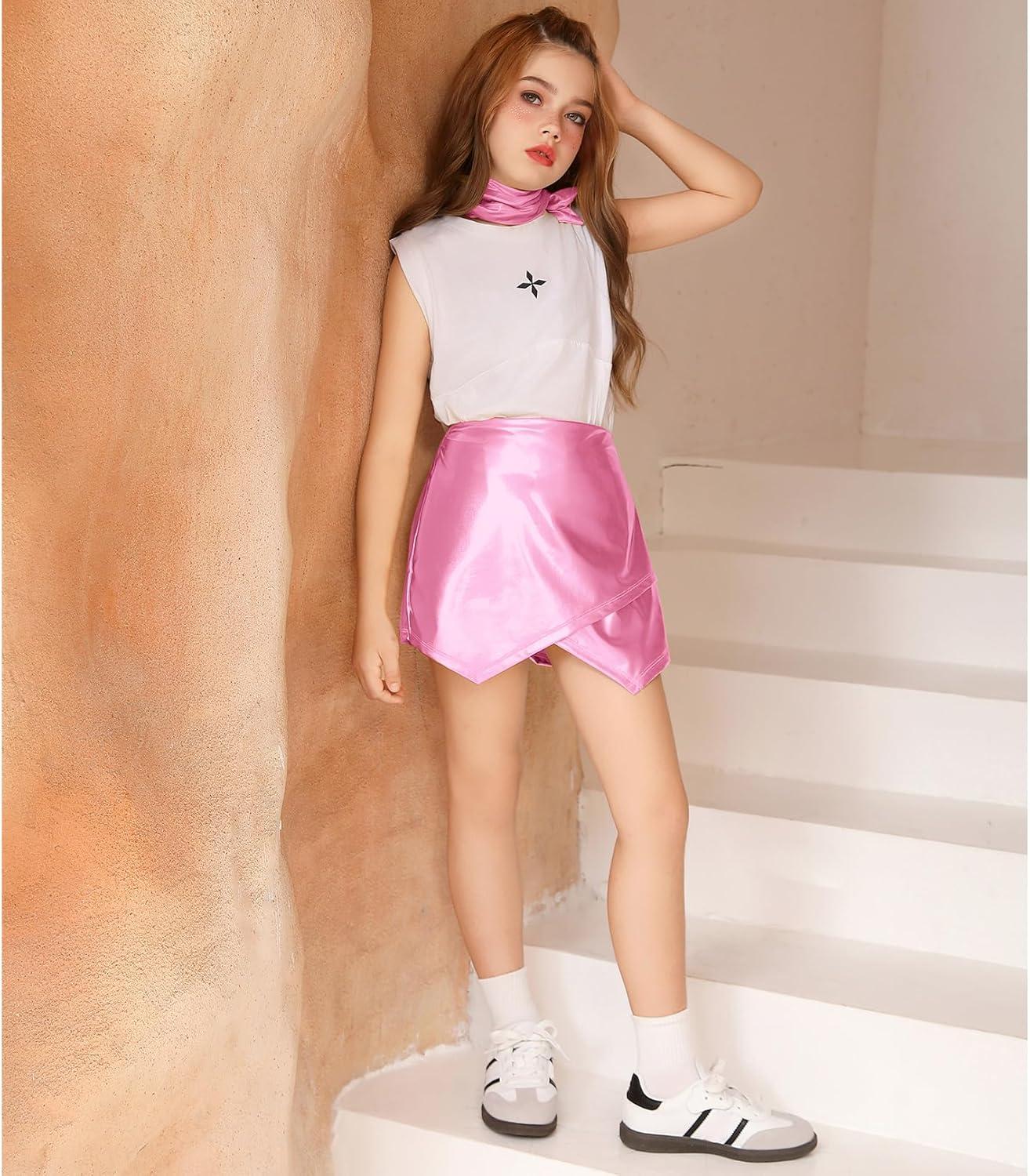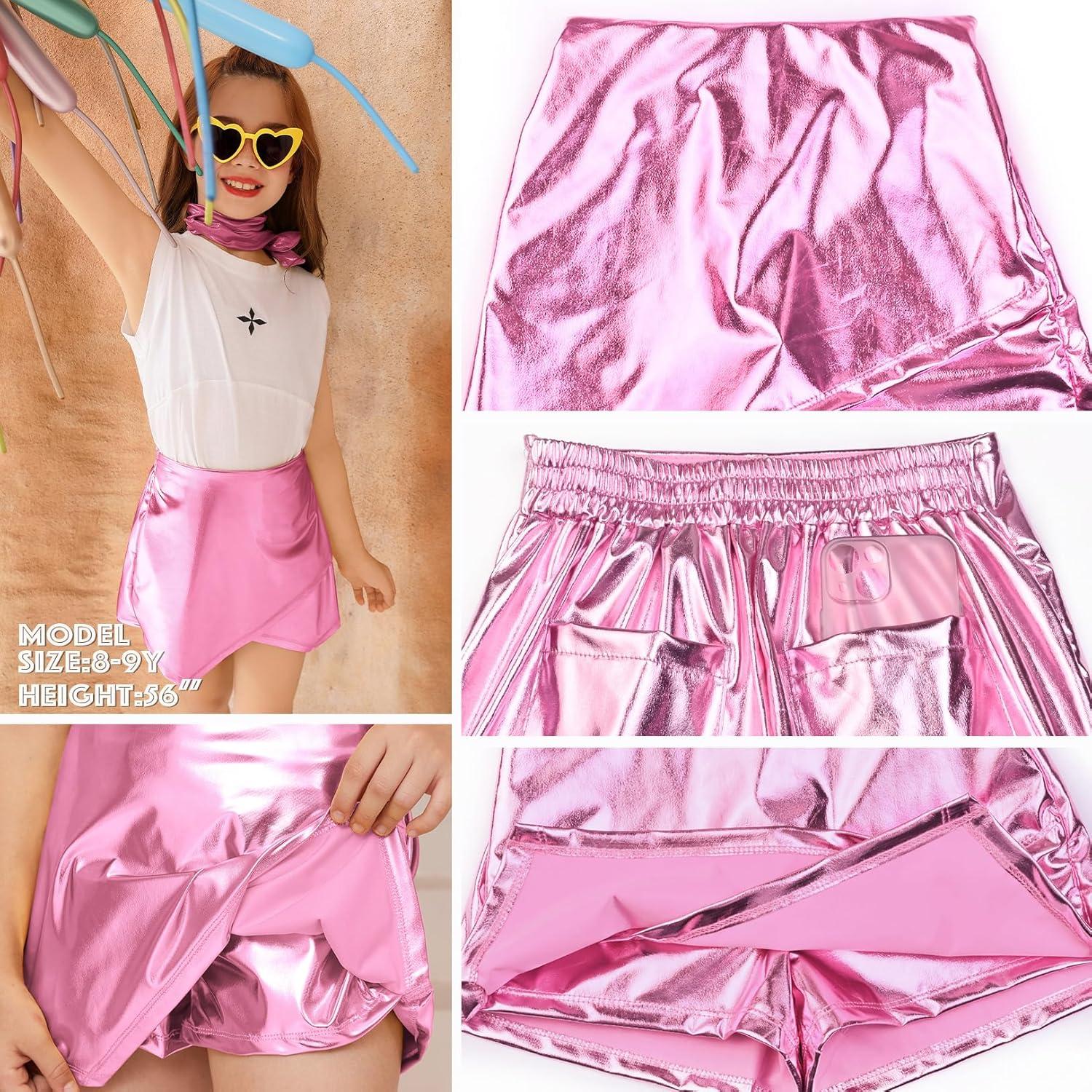 Perfashion Girls Metallic Skort High Waisted Stretchy Metallic Wrap Skirt Shorts Trendy Asymmetrical Skort 4-13Y(Pink12-421)