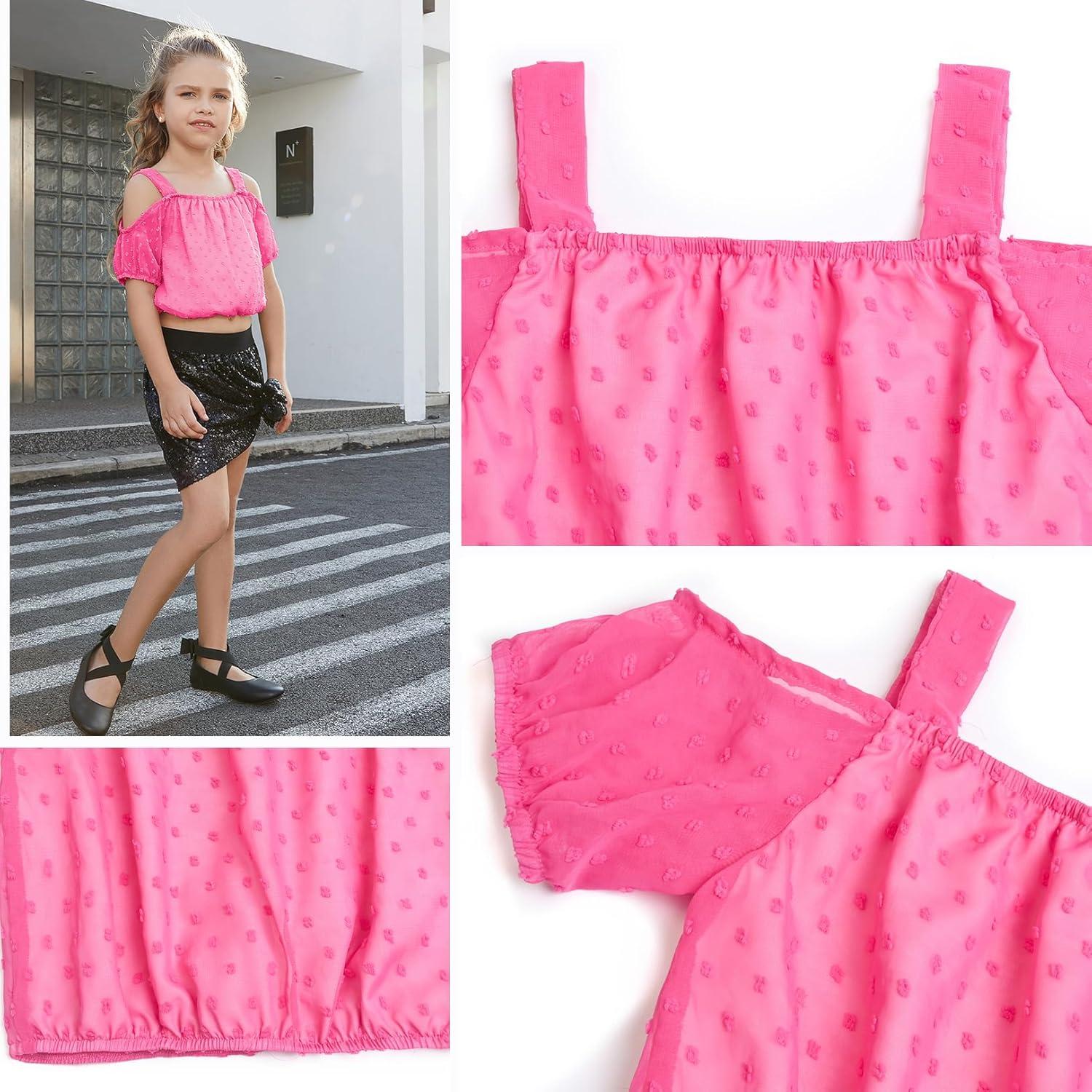 Perfashion Girls Puff Short Sleeve Corp Tops Cold Shoulder Shirts swiss dot chiffon blouse for 4-13 Years(Pink-856)