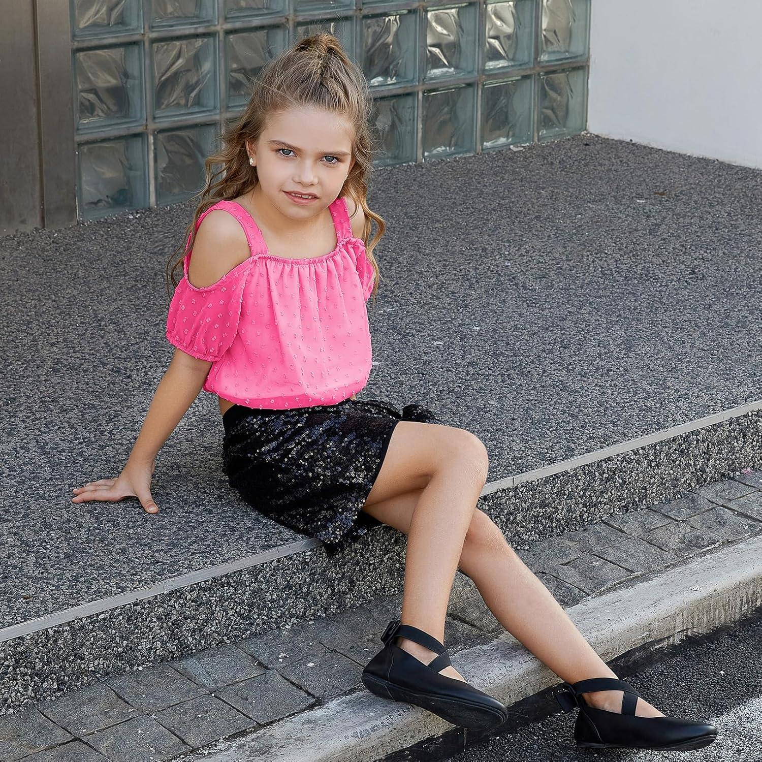 imagePerfashion Girls Puff Short Sleeve Corp Tops Cold Shoulder Shirts swiss dot chiffon blouse for 413 YearsPink856