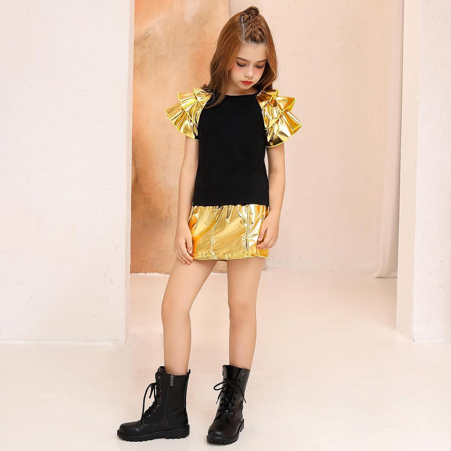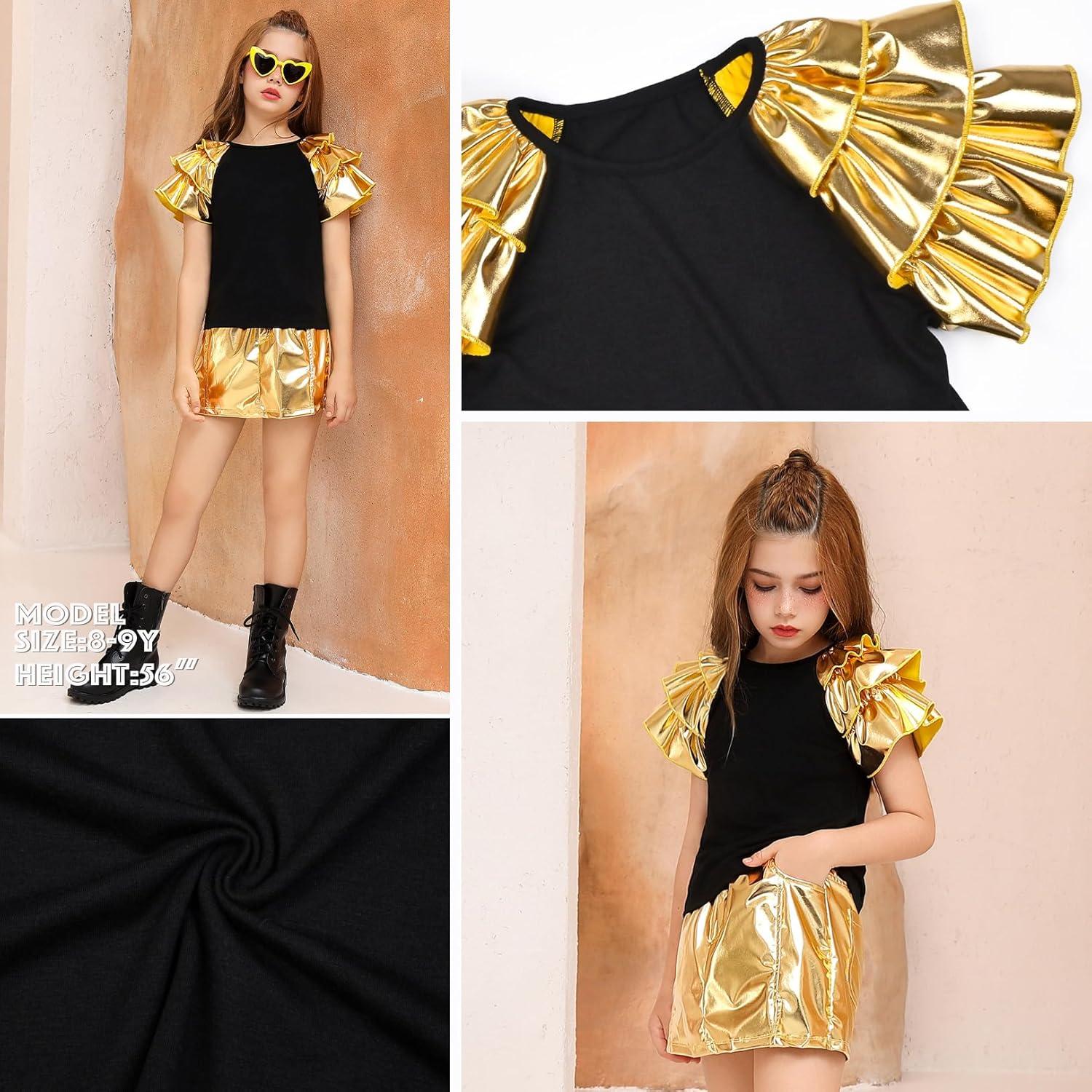 Perfashion Girls Shirts Metallic Ruffle Sleeve Tops Crewneck Summer Tees Hip Hop Dance Party 4-13Y(Gold Sleeve Tops 03-309)