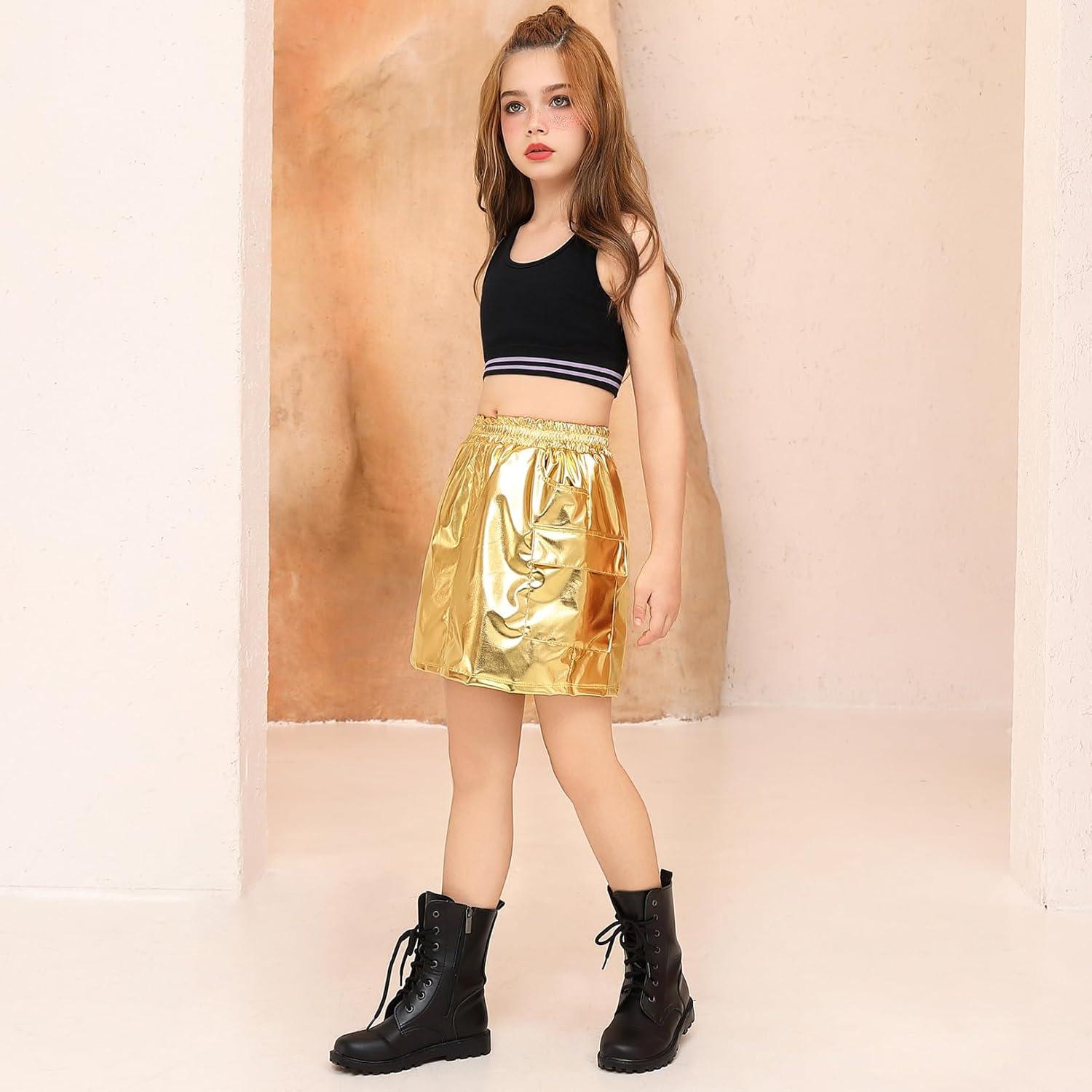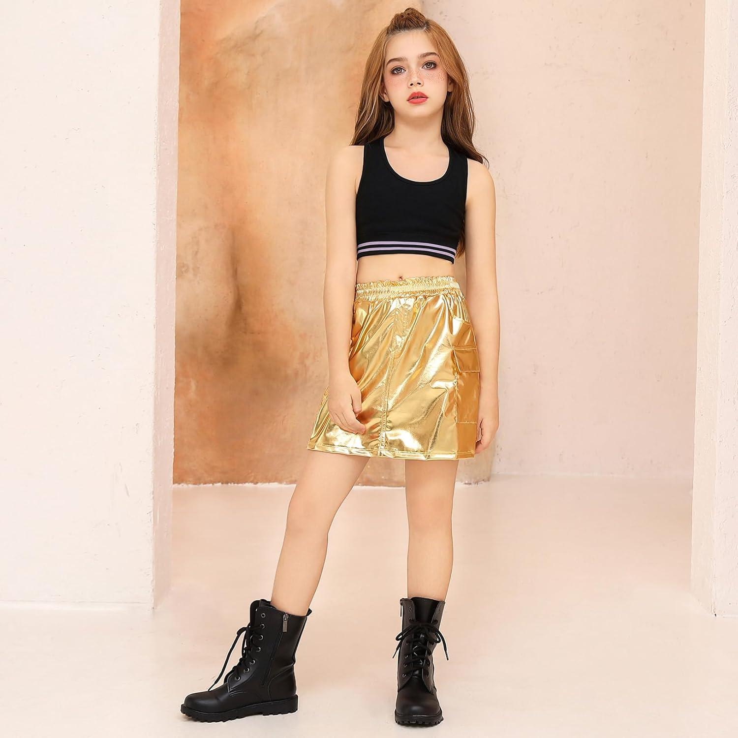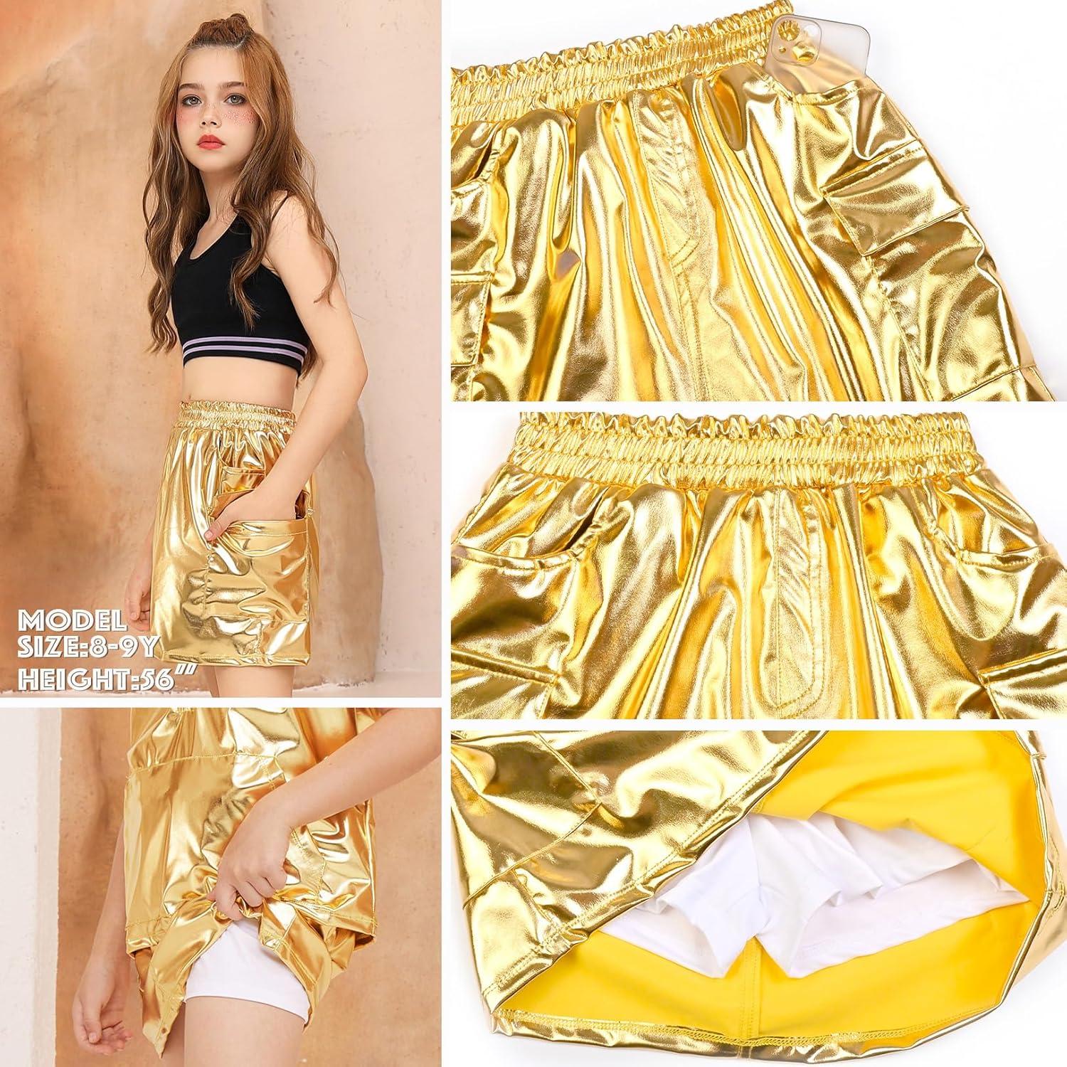 Perfashion Metallic Cargo Skirts for Girls A Line Sparkly Skorts with Multi-Pockets Dance 4-13Y(Gold03-417)